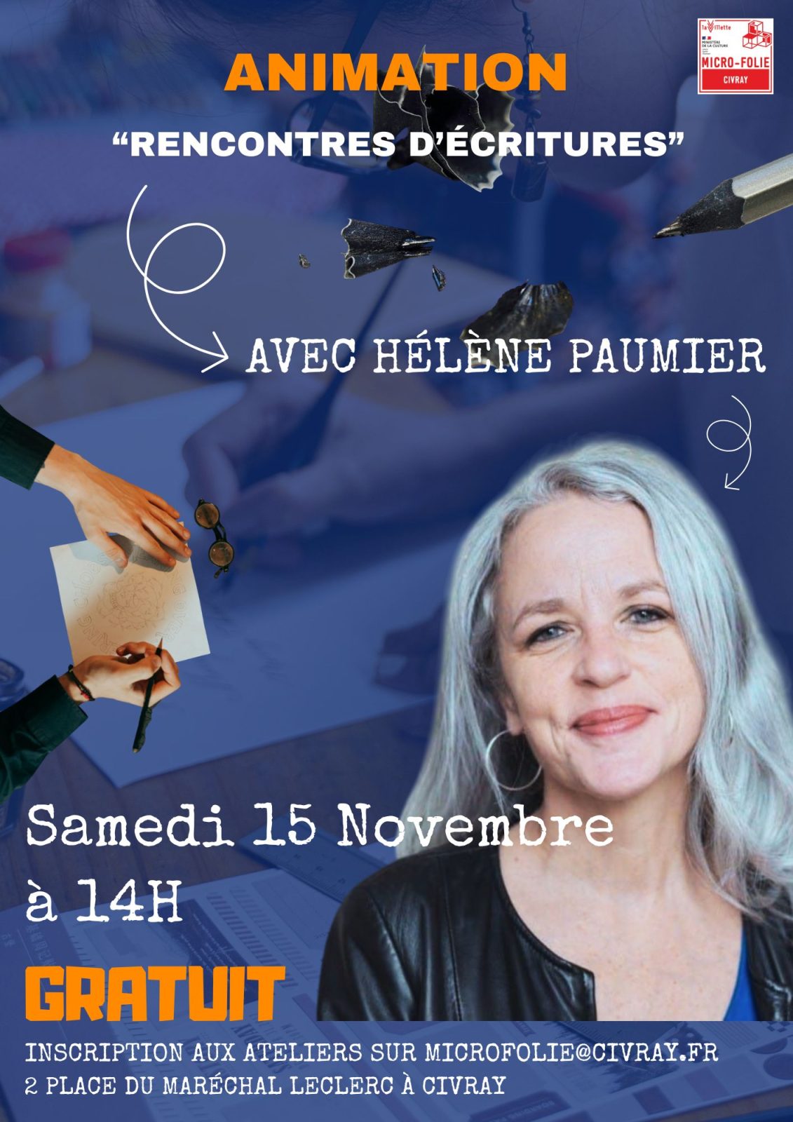 Animation "Rencontres d'écritures" avec Hélène Paumier, animatrice d'ateliers d'écriture. Gratuit. Situation