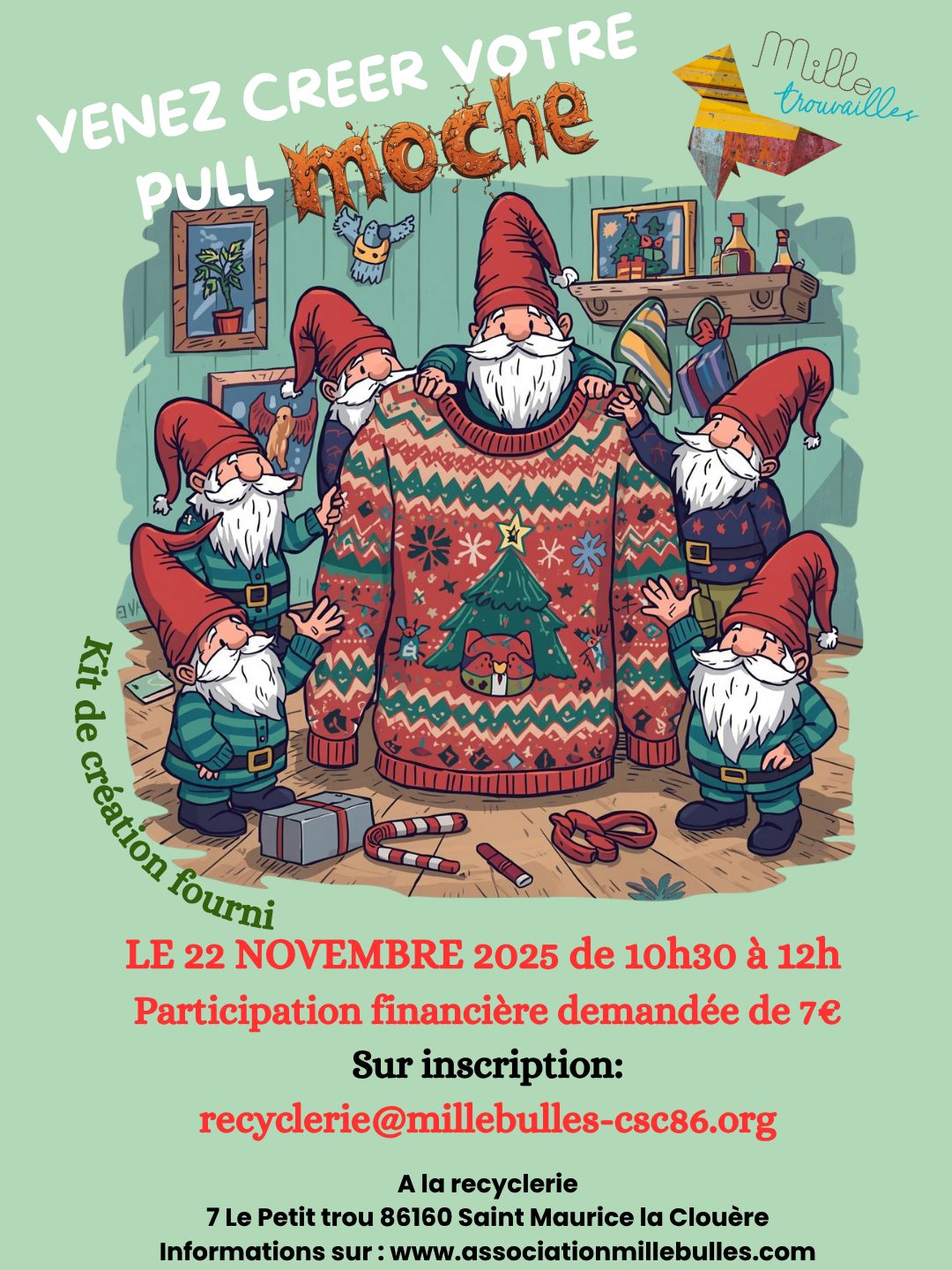 Venez créer votre pull moche ! Kit de création fourni. Sur inscription. Tarifs Tarif Min. Max. Plein tarif 7€ Situation